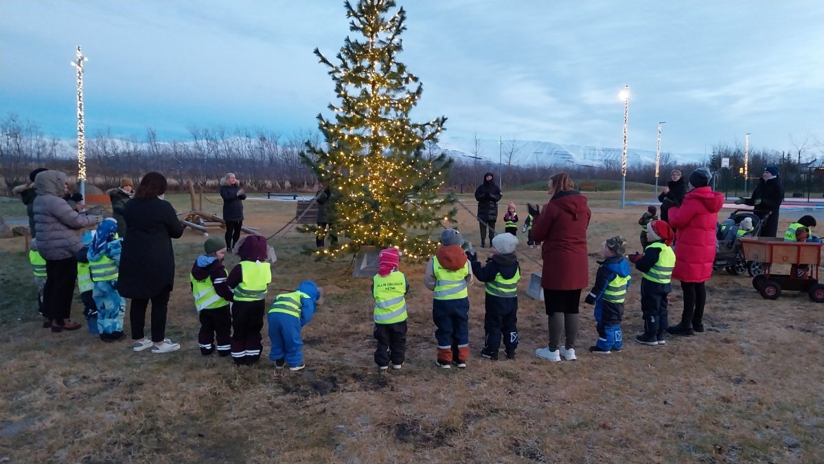 Þann 27. nóvember var okkur boðið á Vinavöll að vera viðstödd þegar jólaljósin voru tendruð á jólatrénu. Í framhaldi bauð starfsfólk skrifstofu börnunum upp á mandarínur.
