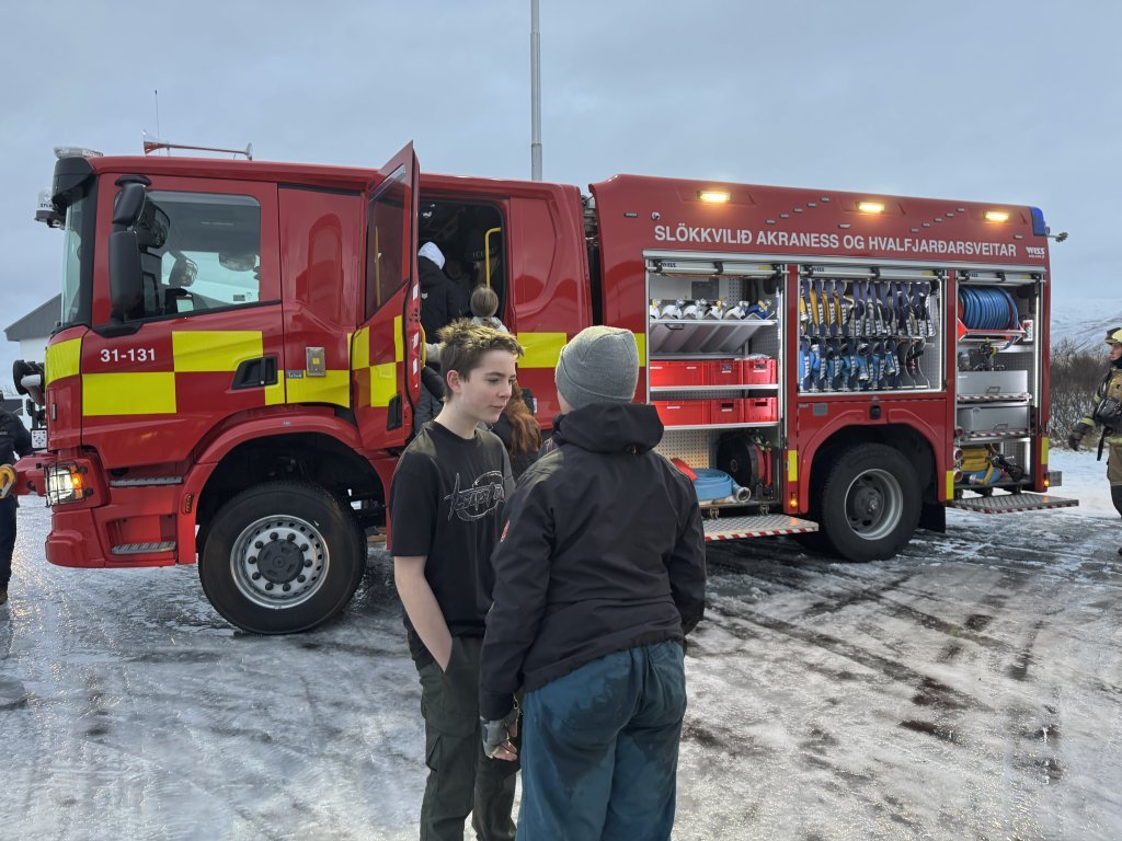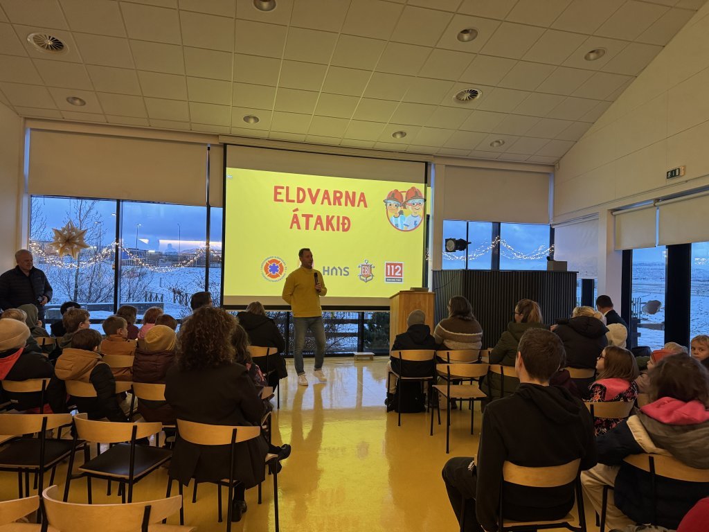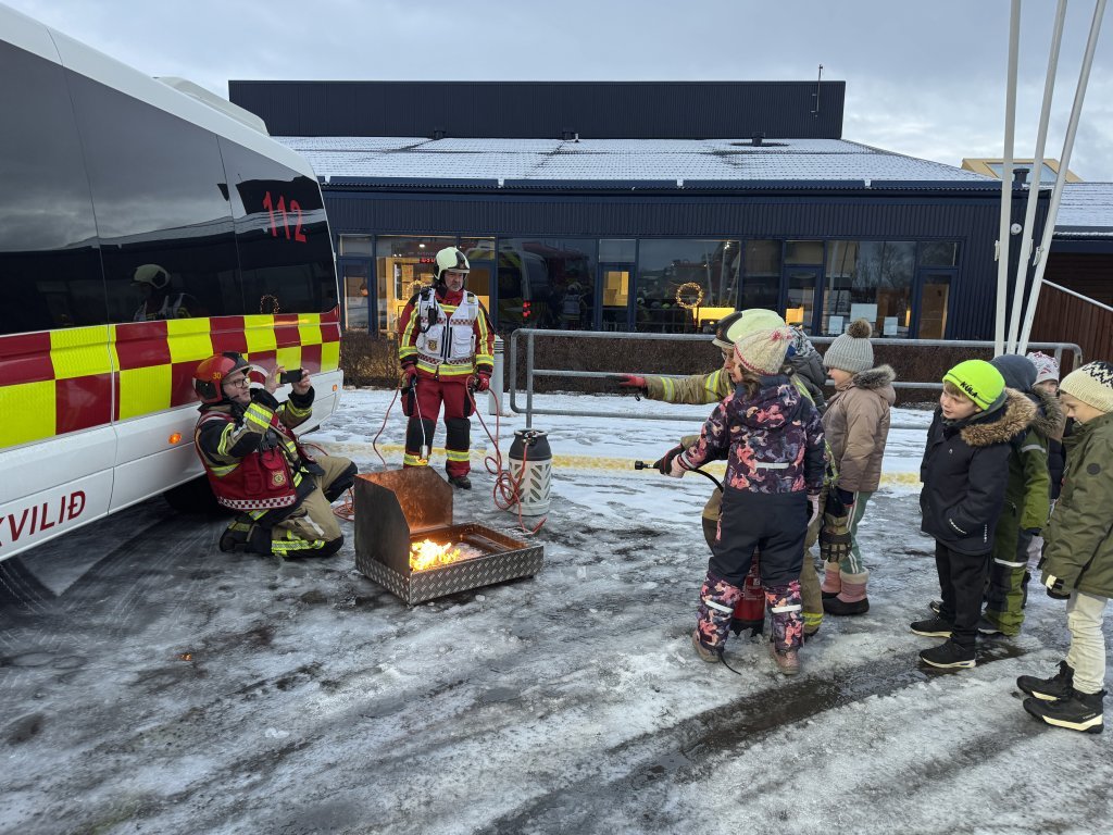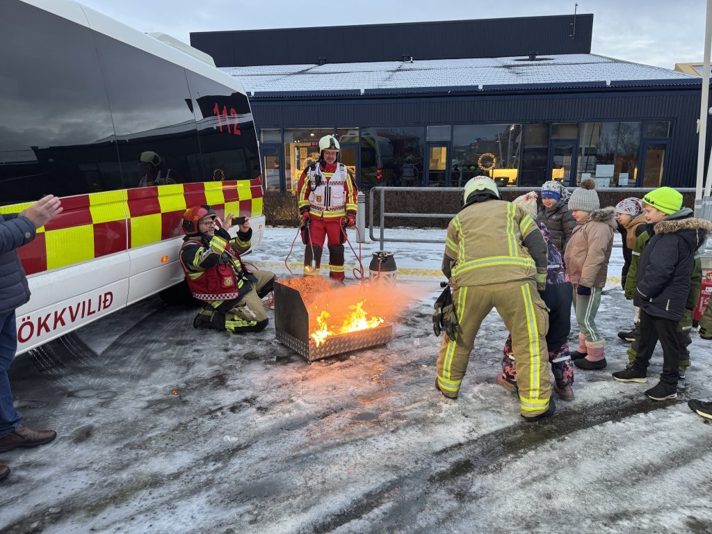 Árlegt eldvarnaátak Landssambands slökkviliðs- og sjúkraflutningamanna fyrir nemendur í 3. bekk hófst í Heiðarskóla sl. fimmtudag. Bjarni Ingimarsson, formaður LSS, fór yfir sögu átaksins en það hefur verið árlegt í 33 ár. Nú hefur sambandið fengið þau Orra óstöðvandi og Möggu Messí með sér í lið og Bjarni Fritzon rithöfundur hefur samið bók um persónurnar sem fara yfir brunavarnir. Bjarni Fritzon las upp úr bókinni fyrir nemendur skólans og vakti það mikla lukku. Nemendur í 3. bekk fengu bókina að gjöf ásamt bókasafni skólans sem fékk einnig áritað eintak að gjöf. Eftir stutta athöfn var haldin rýmingaræfing í skólanum og gestir, nemendur og starfsmenn fengu í kjölfarið að æfa sig í að slökkva eld, skoða stigabíl, slökkviliðsbíl og sjúkrabíl.