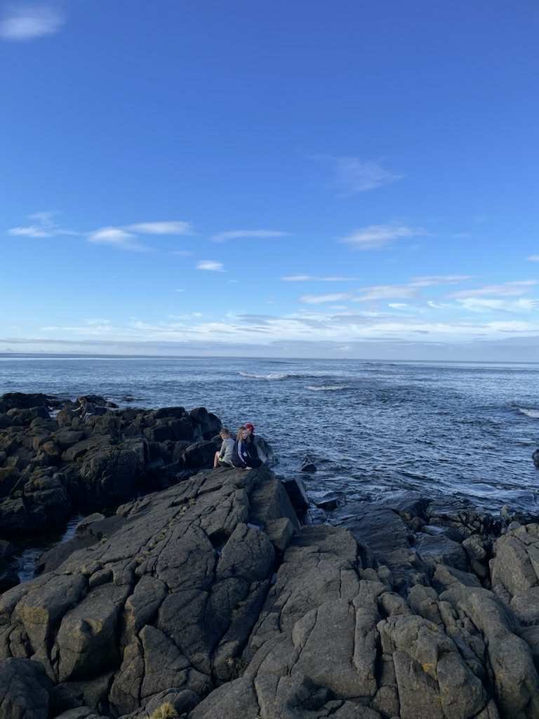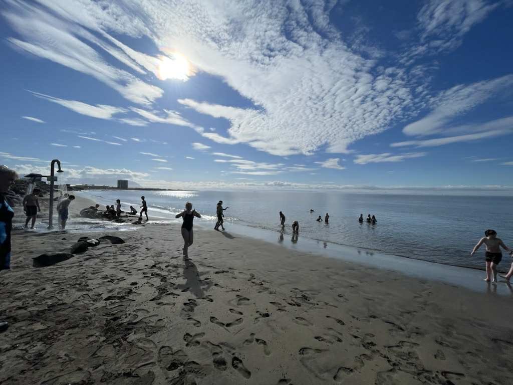 Þegar orkan fór að minnka settist hópurinn niður og gæddi sér á gómsætu nesti. Það var einstaklega notalegt að sitja saman í sólinni, spjalla og njóta stundarinnar. Eftir nestið fóru nemendur í Guðlaugu, heitu laugina á Langasandi. Þar slökuðu nemendur á í heitu vatninu og nutu þess að horfa út á hafið.