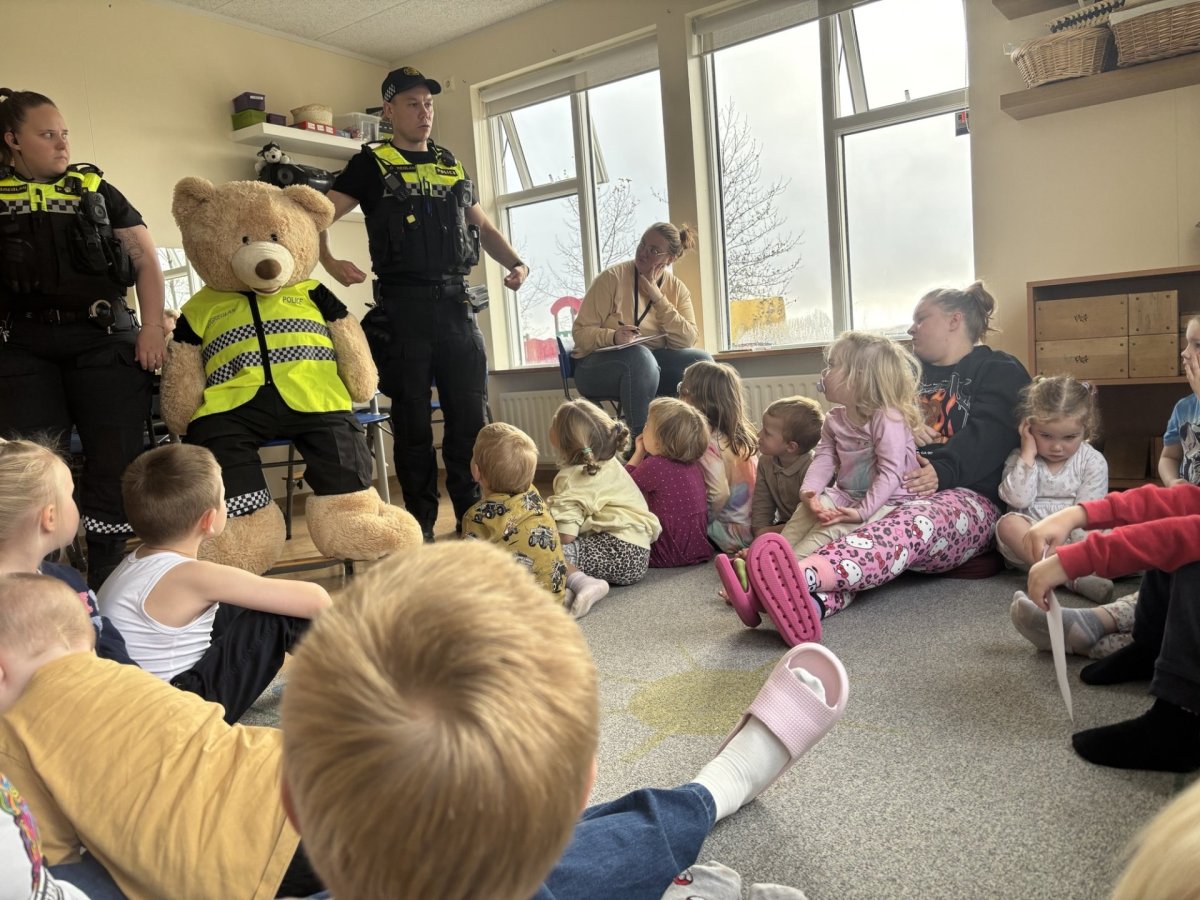 Lögreglan kom í heimsókn á Regnbogann í dag. Lögreglan fór yfir nokkrar umferðarreglur með börnunum, meðal annars hvað á að gera áður en gengið er yfir götu, mikilvægi þess að hafa hjálm þegar við hjólum og vera í bílstól í bílnum. Börnin fengu svo litabók um Lúlla löggubangsa að gjöf og endurskinsmerki.